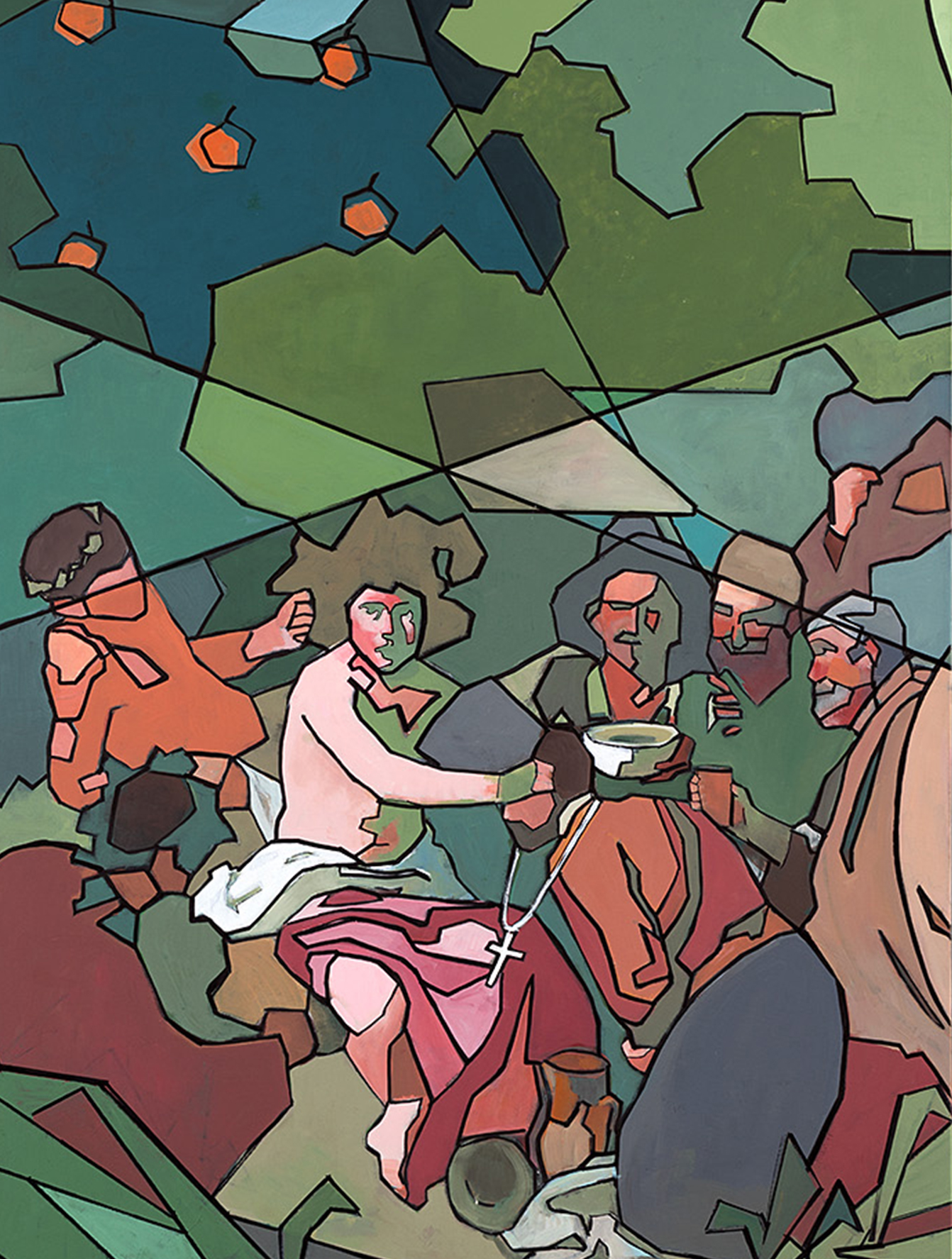 ניסיתי להתחקות אחר סגנונם של ה"אברהמים", ציירי הבזיליקה של ילדותי שעבודותיהם התאפיינו בקו אקספרסיוניסטי חזק, חלוקת חללים פנימית וצורות גיאומטריות, במחשבה שציורי ימלאו את מקומם של ציורי הקיר בבזיליקה / חדר האוכל / גלריה.