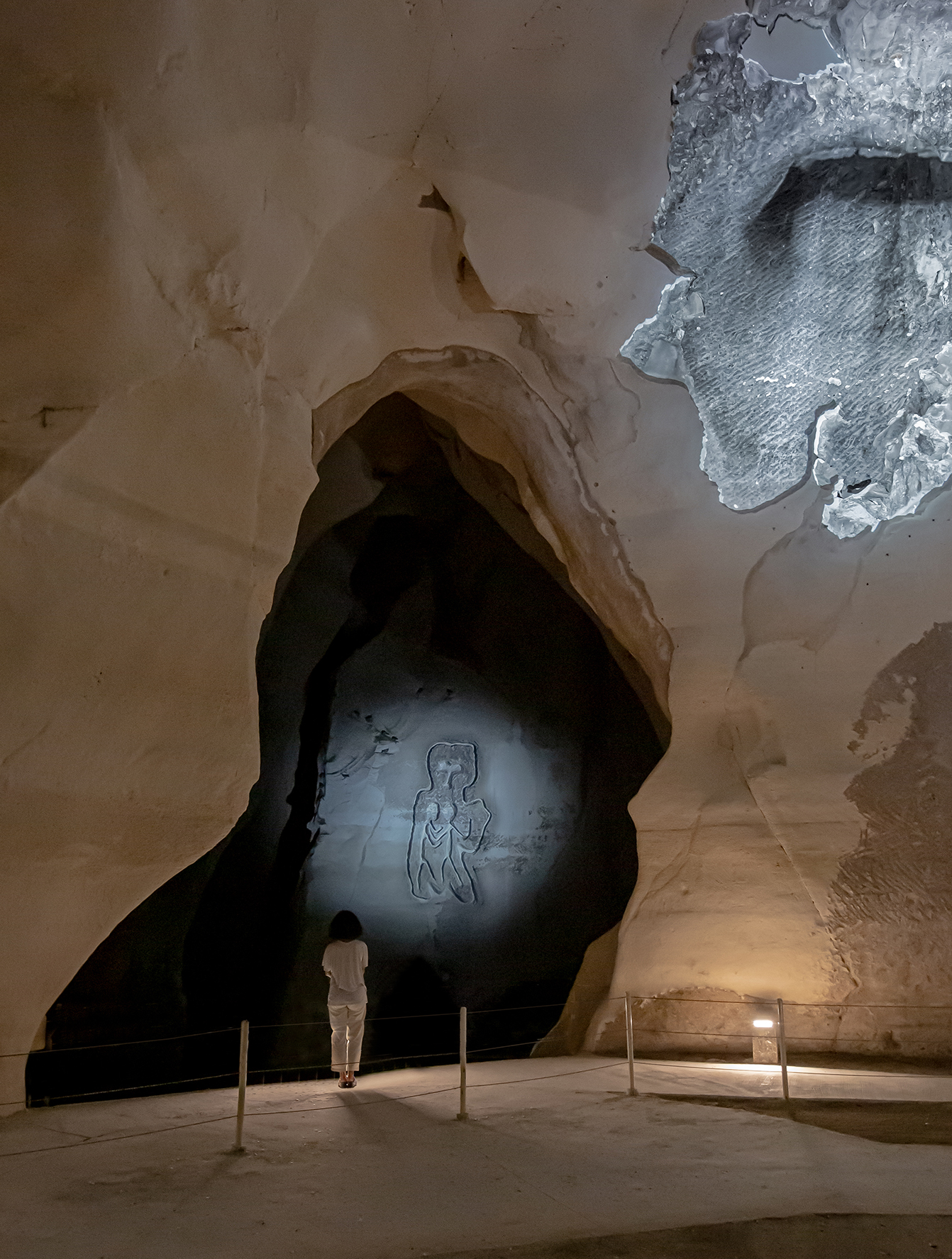 השפה הפרוטו-שמית מתוארכת לתקופה הקודמת לממצא של כתב אלפביתי. ניתן להניח שהייצוג שלה בכתב היה פיקטוגרפי (ציורי) בלבד. אחת מהקרנות הוידאו מציגה רישומים חרוטים באבן, המוקרנים על קירות המערה. אלומת האור של המקרן, המדמה פנס המאיר את החריטות, יוצרת אשליה של עומק ומדמה גילוי של ציורי המערה העתיקים. הרישומים נוצרו בהשראת מילות השיר, ומתוך מחשבה על ייצוג ויזואלי שלהן. הדימויים מאזכרים אמנות אבן וציורי מערות קדומים שהתגלו ברחבי העולם.