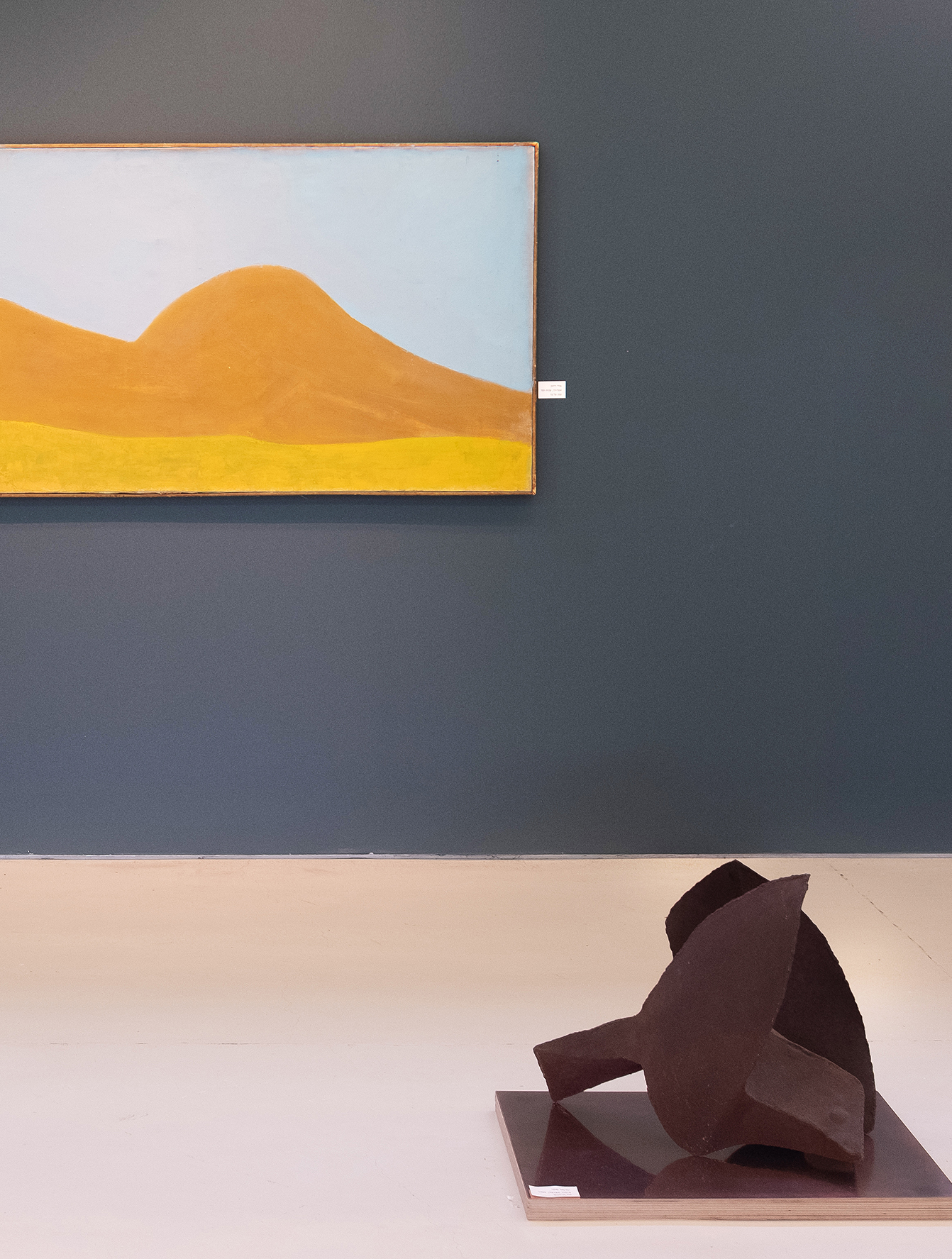 באטליה שמי מוצגת התערוכה בחום עם פס כחול, המציעה מסע של האמנים יחיאל שמי ואורי ריזמן בנוף, ומאפשרת מבט עמוק על ההשפעות ההדדיות ביניהם ובין הנוף, כפי שהתבטאו ביצירתם האמנותית. יחיאל שמי הצליח להביע בעבודותיו המונומנטליות את המורכבות ואת העוצמה של הנוף דרך פשטותו הגאומטרית, ואילו אורי ריזמן עסק בנוף בצורה ישירה יותר, כשתיאר את נופי הגליל תיאור מופשט באמצעות שליטה מופתית בצבע, בצורה ובטקסטורה. הצגתם יחד והקשרים שנרקמים בתערוכה בין פיסול, רישום וציור ובין פסלי הברזל לנופי הציור, מספקים הזדמנות לבחינה מחודשת של גוף עבודותיהם מזווית שונה. קטלוג מחקרי בעריכתם של סמדר שינדלר ויורם ורטה מלווה את שלוש התערוכות. אורי ריזמן יחיאל שמי מפגש מאוחר, 2024 .