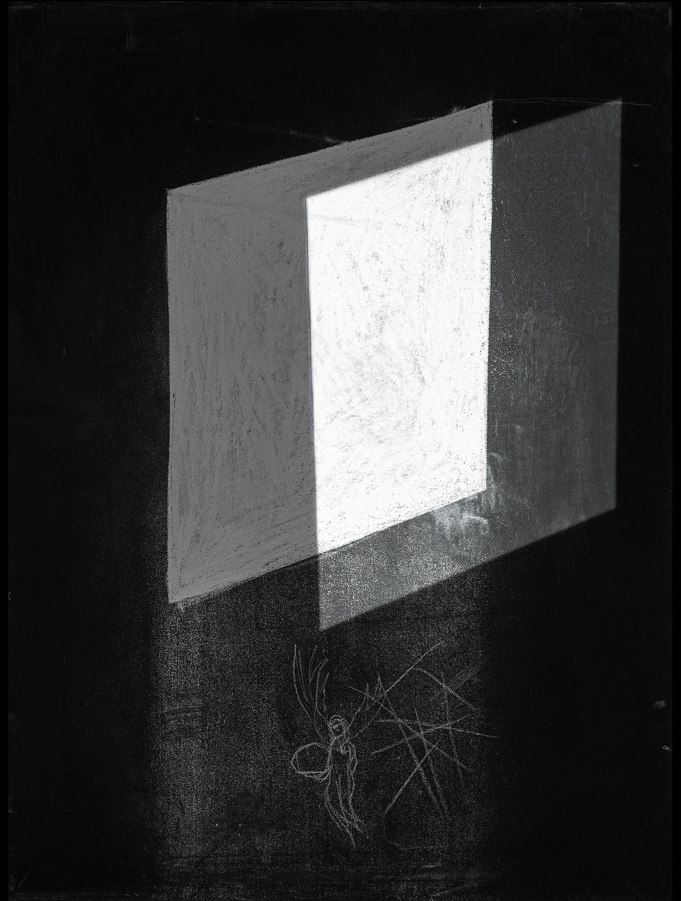 באולם הראשון בולטת נוכחותה של אותה צורה מוארת המופיעה על שני קירות סמוכים, מתהפכת ויוצרת שני מראות מהפנטים; באחד נדמה כי הופכת לשולחן צף, והאבן הכהה המונחת עליה, מאבדת את משקלה. באחר היא הופכת לחלון בוהק כמו פתח לממד אחר. אשר מאחוריו, כמו הד עמום משיב לו רישומו בגיר לבן.