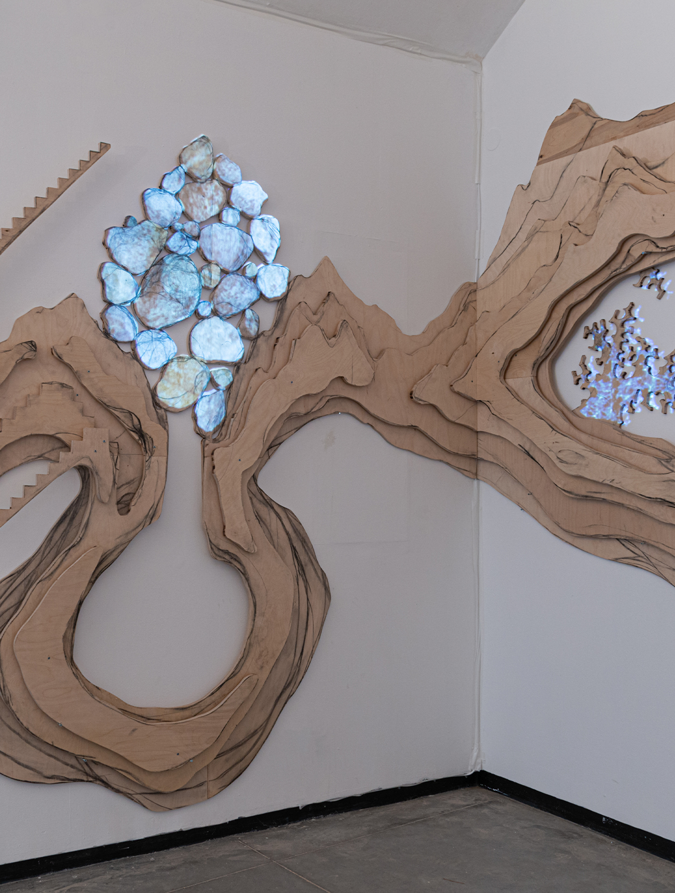 בשנים האחרונות יוצר נדב ויסמן מיצבי קיר המשלבים בין אלמנטים של פיסול בעץ, רישום והקרנות וידאו. סוגי המדיה השונים נפגשים בתבליטי קיר גדולי ממדים הנעים בין דו ממד לתלת ממד, ויוצרים הכלאות בין נוף לגוף, ובין דימויים של טבע נייח ודומם לאיברים אורגניים בתנועה. התערוכה "תת קרקע" היא מיצב תלוי מקום המקיף את חלל התצוגה מכל עבריו, כתמונת נוף פנוראמית שהעין אינה יכולה ללכוד במבט אחד. ויסמן מייצר הכלאה בין נוף עילי פתוח לחללים פנימיים סגורים. הוא יוצר נוף גופני מאוד הבנוי מחמוקיים משתפלים, מנקבות רחמיות ומחללים פנימיים, שהדימויים המוקרנים עליהם מפיחים בהם תנועה וחיים. זהו נוף תת קרקעי מדומיין, רוחש סודות ומטענים המבעבעים בו מתחת לפני השטח, המשקף את מציאות החיים הסבוכה באזור משני עברי הגבול, אך לא רק.